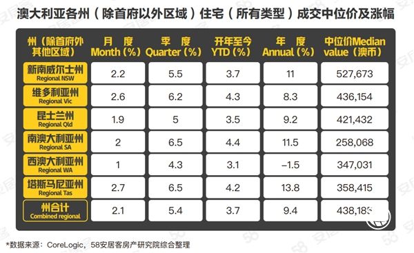 除州府以外的其他区域中,房地产市场复苏过程也颇为亮眼,涨幅最大的是塔斯马尼亚州,环比和同比涨幅均排名第一,分别录的2.7%和13.8%的上涨,房屋中位价为358,415美元。其次是维多利亚州,环比上涨2.6%,同比上涨8.3%,房屋中位价为459,787美元。新南威尔士州环比上涨2.2%,同比上涨11%,房屋中位价527,673美元,房屋价格是所有州中最高的。6个州房屋价格合计环比上涨2.1%,季度上涨5.4%,年度同比上涨9.4%,涨幅高于州府及首府城市。