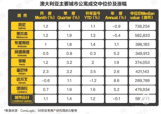 据CoreLogic,58安居客房产研究院综合整理,分房屋类型来看,8个主要首府和首都城市中,别墅价格涨幅普遍高于公寓。8城合计的别墅月涨幅2.3%,季涨幅4.8%,年涨幅4.4%,均高于公寓的月涨幅1.2%,季涨幅1%,年涨幅-0.9%。
