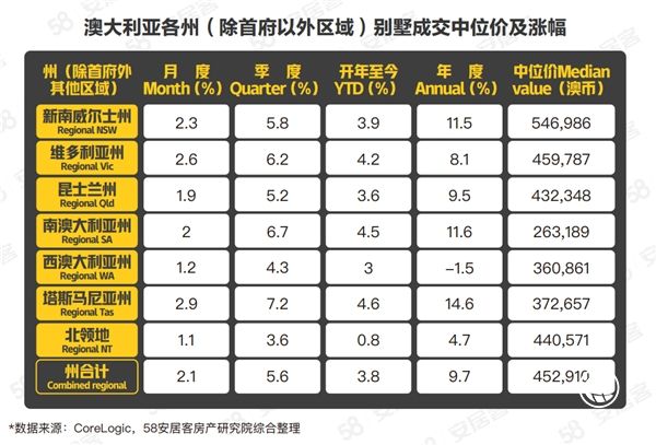 各州非首府区域的别墅价格涨幅并不弱于首府城市,6个州加北领地的别墅合计月涨幅2.1%,季涨幅5.6%,年涨幅9.7%,这也显示出,澳大利亚房地产市场复苏的可观程度。尽管非城市区域的别墅月涨幅稍逊于城市,但年涨幅却大幅跑赢城市。其中,塔斯马尼亚州、维多利亚州、新南威尔士州别墅月涨幅均超2%,且年涨幅均高于11%,别墅行情持续升温。