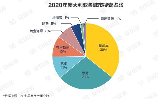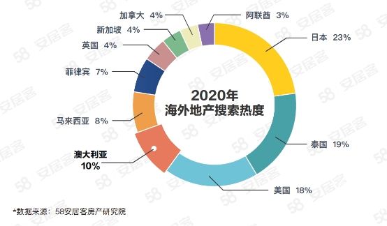 澳大利亚舒适的地理环境、慢节奏的生活状态,成为中国居民海外置业的热门目的地。在澳所有海外商业和住宅房地产投资中,来自中国的投资约占总额的四分之一。58同城、安居客海外地产在线搜索数据显示,2020年澳大利亚地产搜索热度在所有海外国家及地区中排名第四,次于日本、泰国、及美国;搜索量占前十国家总量的11.1%。