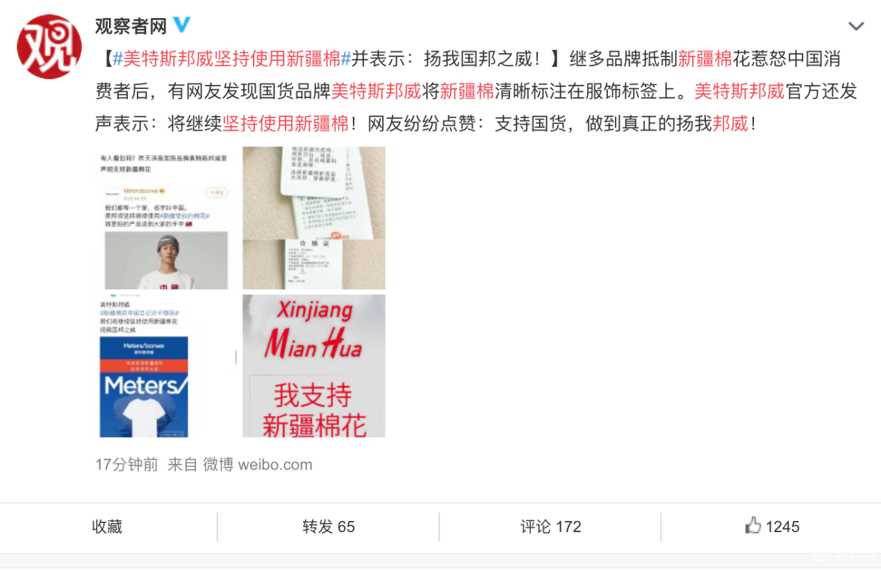 就在多个外籍品牌联合抵制新疆棉、向新疆棉花泼脏水时,有细心的网友发现国货时尚服饰品牌美特斯邦威将“新疆棉”清晰标注在服饰面料标签上。美特斯邦威官方微博郑重表示:将继续坚持使用新疆棉,扬我国邦之威!