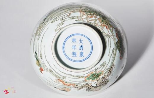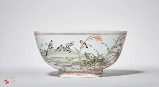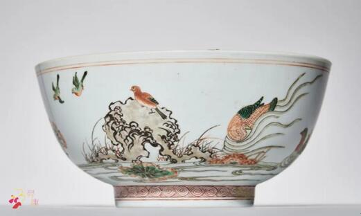 碗口微敞,深腹下敛,圈足,胎质细密,釉面莹白。碗外壁五彩绘荷塘秋禽之景:荷塘山石芦苇之间,鸳鸯翠鸟,或在飒飒秋风中展翅双飞,或在岸边草丛间成对觅食,或静立于芦苇枝头,或停驻暂歇于枯石。鸳鸯逡巡水上,层层涟猗泛起,又如秋风乍起,波光粼粼。水面上,荷叶已黄半边,随风摇曳,与嶙峋石岸、石间野草相映衬,图中设色浓淡分明,空间层次感强,荷塘秋景,幽谧天成,极富野趣。