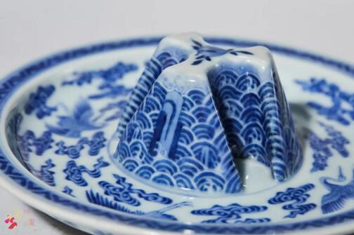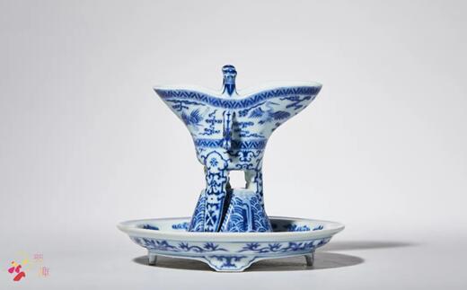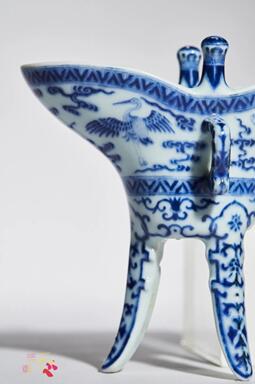 下承三个尖状长足,器身青花为饰,爵身主体纹饰为云鹤纹,寓意长寿。三足以变形蕉叶装饰,构思巧妙。以青铜器古朴瑰丽的造型与清代纹饰相结合,焕发出新颖的艺术魅力。