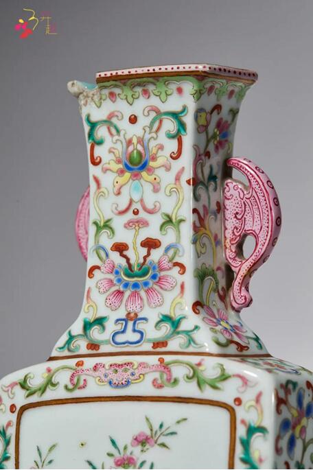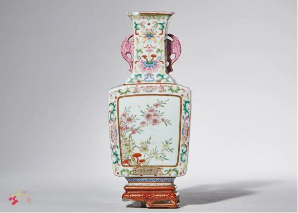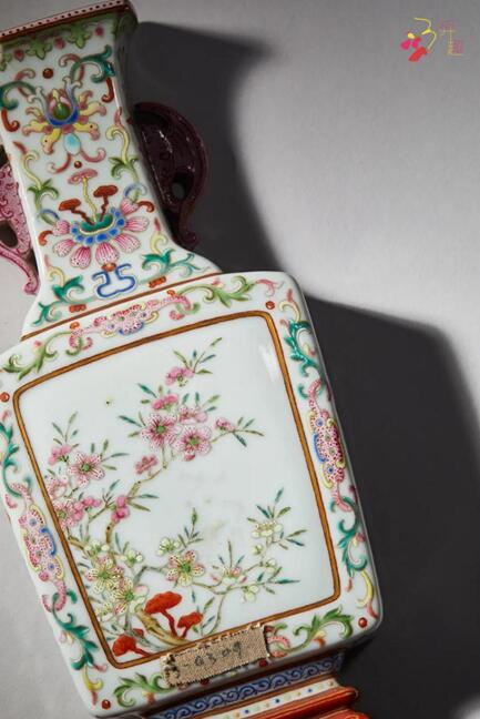 拍品为一侧平面,撇口,长颈,折肩,腹部近底稍敛,下承托泥,颈部两侧贴塑双蝠耳。通体饰粉彩缠枝莲纹,腹部开光绘粉彩桃花纹饰,花团锦簇,风姿绰约,呈现出富贵祥和的气派。底书矾红彩“乾隆年制”四字篆书横款。
