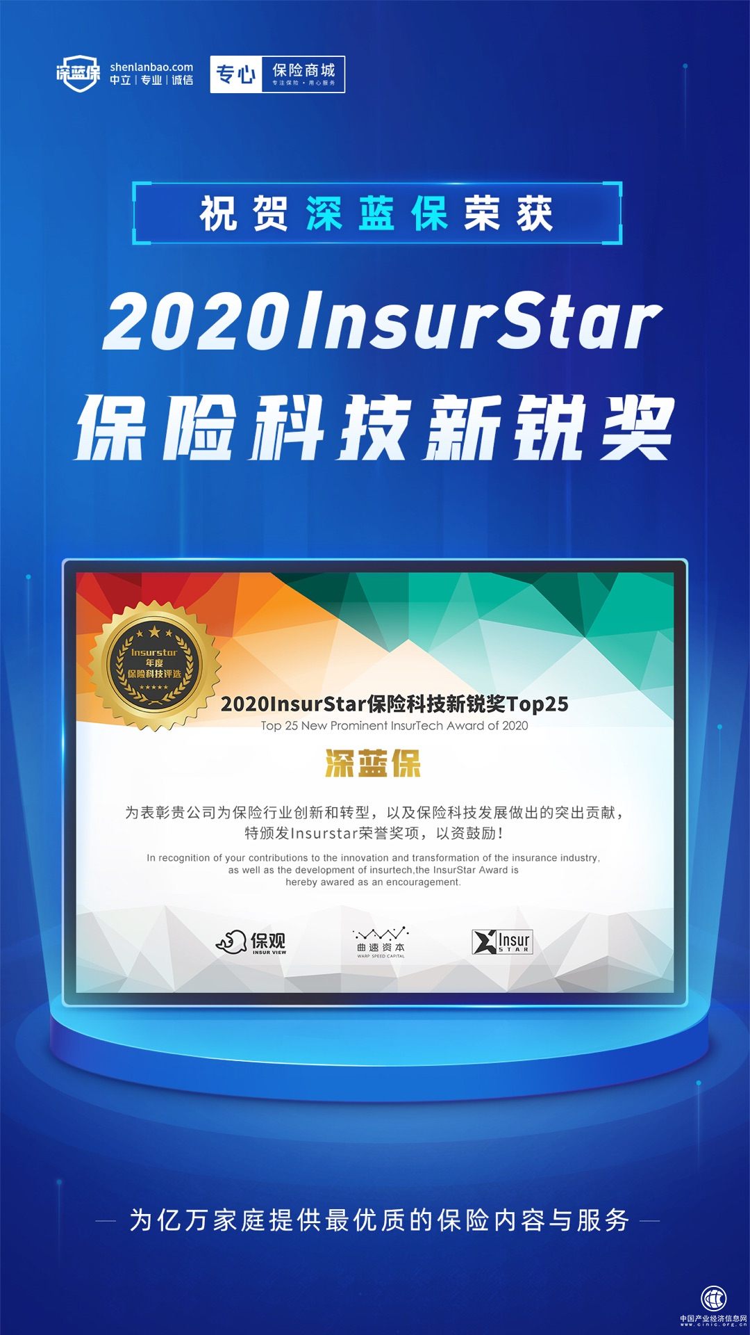 ▲深蓝保荣获保观“2020 InsurStar保险科技新锐奖”