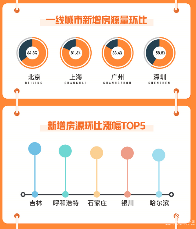 从全国市场供应方面来看,58同城、安居客报告显示全国新增挂牌房源量环比上涨83.9%。一线四城均有不同程度的上涨,其中,广州环比涨幅最高达到83.4%。从全国范围来看,吉林、呼和浩特、石家庄、银川和哈尔滨的新增房源环比涨幅领先其他城市。