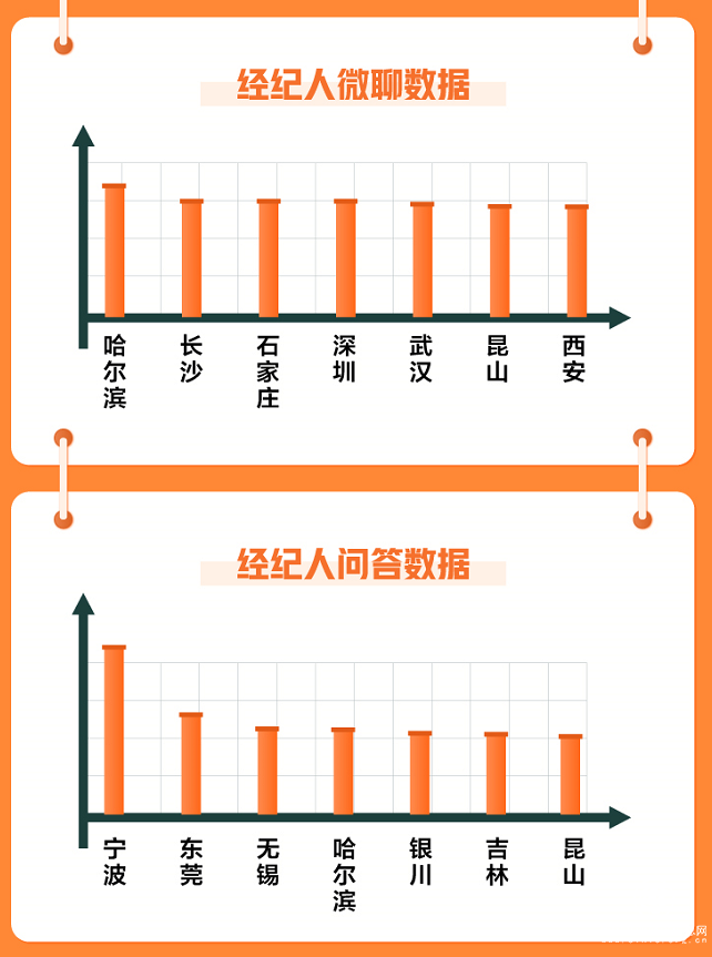 二手房热度经纪人先知,58同城、安居客通过微聊数据统计显示,3月份哈尔滨、长沙、石家庄、深圳、武汉等地购房者更愿意与经纪人沟通,哈尔滨微聊数据环比涨幅最高。宁波、东莞、无锡、哈尔滨和银川等城市经纪人更乐于解答房产问题,经纪人问答数据环比均出现2倍以上的涨幅,其中,宁波环比涨幅排名最高。对于目前二手房市场,58同城、安居客《3月国民安居指数报告》数据显示,2021年3月经纪人信心指数为112.6,环比下跌1.0%。