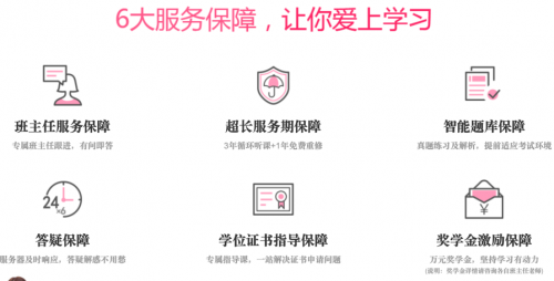 恒企教育推行6大服务保障,让你爱上学习。班主任服务保障,让你重返学较的感觉油然而生;3年循环听课,1年内免费重修,超长服务期限更有保障;智能题库,真题练习及解析,提前适应考试节奏;24小时答疑解惑,问题不过夜;学位证书指导申请,帮你一站式解决;万元奖学金激励,坚持学习动力足。