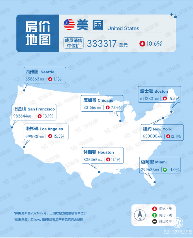 根据58同城、安居客《3月海外地产房价地图》显示,截止2021年2月,美国成屋销售中位价为333317美元,同比上涨10.6%。洛杉矶以999000美元的成屋销售中位价领先其他地区,旧金山和波士顿分别以983644美元、671333美元紧跟其后,同比分别上涨13.1%和15.5%。纽约成屋销售中位价为650000美元,同比上涨12.1%;迈阿密、休斯顿和芝加哥均处于30万美元以上水平。
