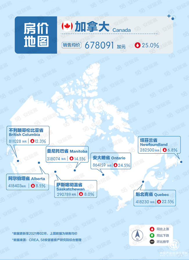 截止2021年2月,加拿大房屋销售均价为678091加元,同比上涨25%,涨幅处于相对较高水平。分地区来看,安大略省以864159加元的销售均价排名最高,不列颠哥伦比亚省以811028加元的销售均价紧随其后。魁北克省销售均价为418230加元,同比上涨22.5%。萨斯喀彻温省和纽芬兰省均处于20万加元以上梯队。