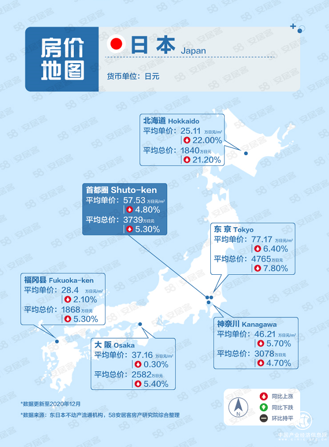 截止2020年12月,日本首都圈房屋平均单价为57.53万日元/㎡、平均总价为3739万日元。东京房屋平均单价为77.17万日元/㎡,同比上涨6.4%;房屋平均总价为4765万日元,同比上涨7.8%。神奈川房屋平均单价仅次于东京为46.21万日元/㎡,同比上涨5.7%;房屋平均总价为3078万日元,同比上涨4.7%。北海道房屋平均单价为25.11万日元/㎡,同比涨幅最高达到22.0%;房屋平均总价为1840万日元,同比涨幅同样领先其他区域为21.2%。