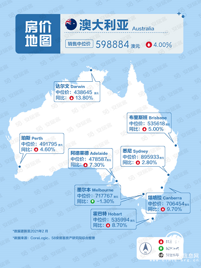 58安居客房产研究院综合整理澳大利亚房价显示,2021年2月房屋销售中位价为598884澳元,同比上涨4.0%。悉尼房屋销售中间价为895933澳元,领先其他区域。墨尔本房屋销售中间价以717767澳元的水平排在其后。首都堪培拉房屋销售中间价为706454澳元跻身前三。布里斯班和霍巴特房屋销售中间价均处于50万澳元以上水平。