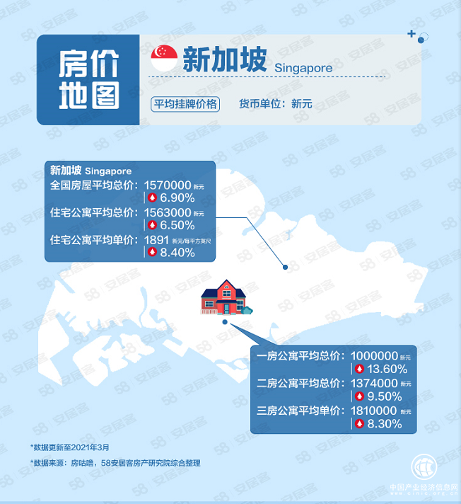 截止2021年3月,新加坡全国房屋平均总价为1570000新元,住宅公寓平均总价为1563000新元,住宅公寓平均单价为1891新元/平方英尺。其中,一房公寓平均总价为1000000新元,二房公寓平均总价为1374000新元,三房公寓平均单价为1810000新元。