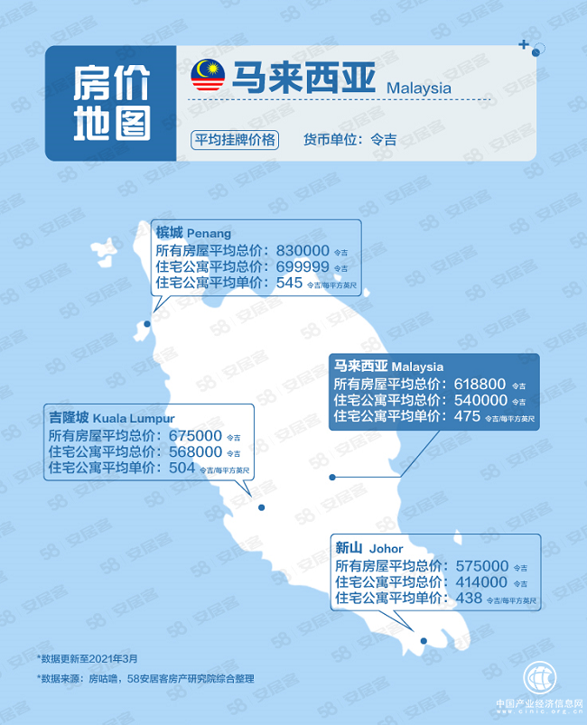 58同城、安居客《海外地产房价地图》显示,截至2021年3月,马来西亚所有房屋平均总价为618800令吉,住宅公寓平均总价为540000令吉,住宅公寓平均单价为475令吉/平方英尺。位于第一梯队的槟城所有房屋平均总价为830000令吉,住宅公寓平均总价为699999令吉,住宅公寓平均单价为545令吉/平方英尺。第二梯队的吉隆坡所有房屋平均总价为675000令吉,住宅公寓平均总价为568000令吉,住宅公寓平均单价为504令吉/平方英尺。第三梯队的新山所有房屋平均总价为575000令吉,住宅公寓平均总价为414000令吉,住宅公寓平均单价为438令吉/平方英尺。