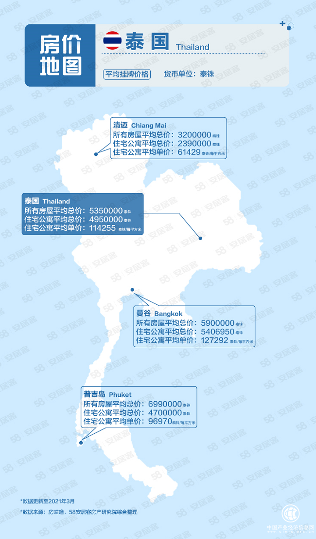 截止2021年3月份数据,泰国所有房屋平均总价为5350000泰铢,住宅公寓平均总价为4950000泰铢,住宅公寓平均单价为114255泰铢/平方米。普吉岛所有房屋平均总价最高为6990000泰铢,曼谷所有房屋均价低于普吉岛为5900000泰铢,但是曼谷住宅公寓平均总价5406950泰铢、住宅公寓平均单价127292泰铢/平方米,均高于普吉岛的4700000泰铢总价和96970泰铢/平方米平均单价。清迈处于相对较低水平,所有房屋平均总价为3200000泰铢,住宅公寓平均总价为2390000泰铢,住宅公寓平均单价为61429泰铢/平方米。