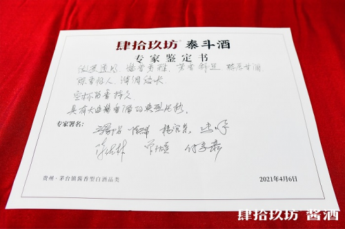 肆拾玖坊联合创始人、酒体研发部总经理张传远看到专家们的评语后,说道:“微黄透明、空杯留香持久、具有大曲酱香酒典型风格,对一般的酱酒都会有这样的评价。但是如果能做到酱香突出、醇厚甘润、陈香怡人,这是对优秀乃至经典产品的评价。市场上大多产品很难达到这样的评语。这也代表了整个专家团队对泰斗酒的高度认可。”
