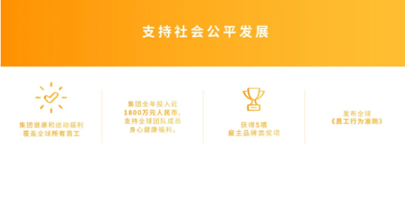 2020年,集团全年投入近1800万元人民币,支持全球团队成员身心健康福利。截至2020年底,集团全球已有3400多名团队成员分布在13个国家和地区。获得年度最佳雇主、中国健康工作场所黄金标准认证企业等5项认可。