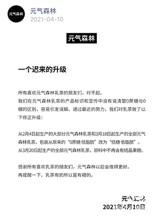 近日,快消领域的软饮新秀“元气森林”在官方公众号发布一则《迟来的升级》公告称,元气森林乳茶产品标识和宣传中没有说清楚“0蔗糖”与“0糖”的区别,容易引发误解,为此进行修正升级:从2月4日起生产的大部分乳茶和3月18日生产的全部乳茶,包装从原来的“0蔗糖低脂肪”改为“低糖低脂肪”。同时,从3月20日起生产的全部元气森林乳茶,原料中不再含有结晶果糖。该公告迅速被推向微博热搜等社交平台,媒体报道随之跟进,众说纷纭。