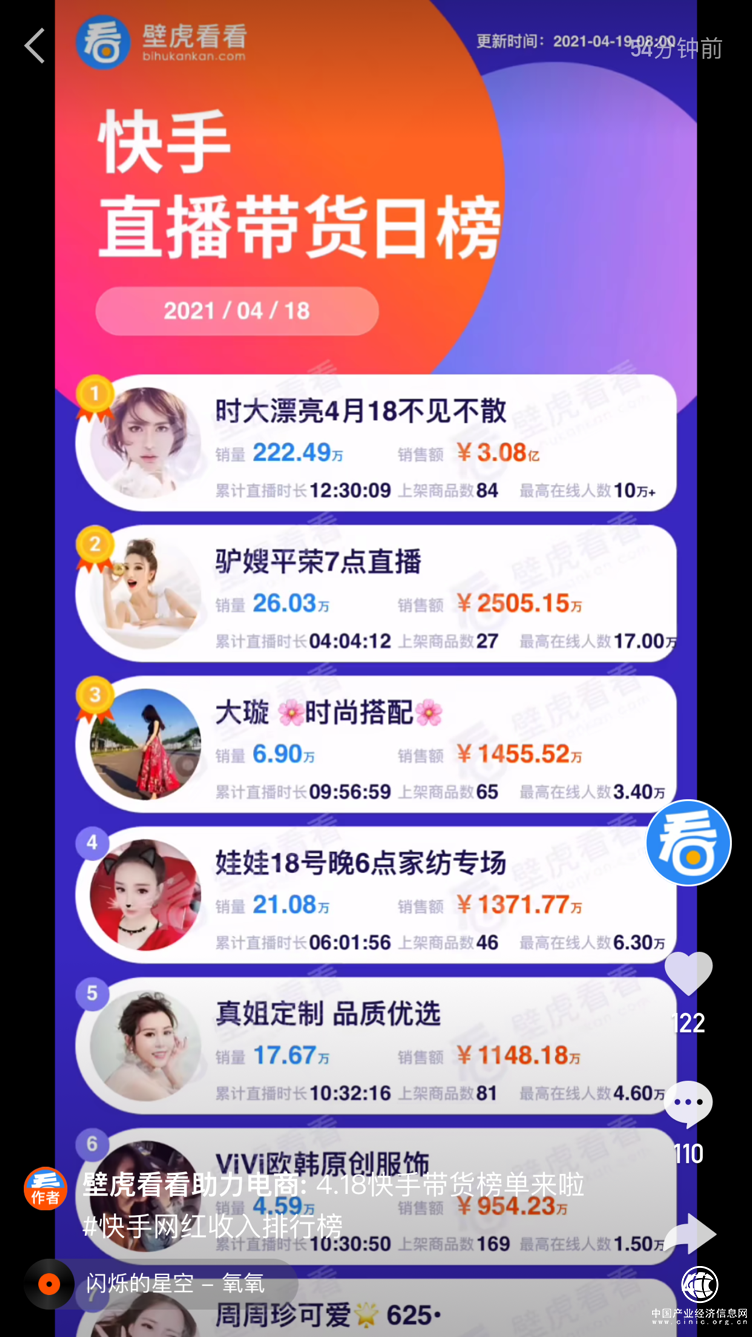 4月18日,时值时大漂亮加入辛选首播一周年之际,也是本年度其作为国际大牌选品官的首次直播,经过几个月的精心准备,有备而来的时大漂亮携手天猫国际妙颜社和30多个国内外大牌共同为快手用户带来一场堪比国际秀场的时尚购物盛宴。据第三方平台“壁虎看看”显示,这场时长12.5小时的直播上架商品84款,销售额超过3亿元,销售额高居当天平台直播带货日榜之首。据悉,2020年4月18日,时大漂亮曾以快手“品牌发现官”的身份为大牌美妆等产品带货,GMV破5亿。