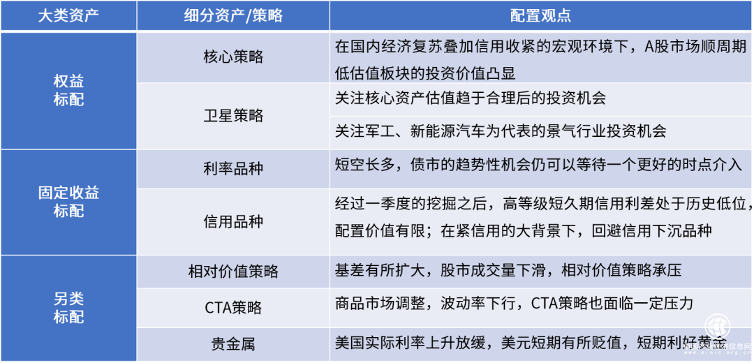 CTA (管理期货) 策略: 商品市场走势出现分化,波动率逐步下行,其中黑色板块持续创新高,农产品等板块持续势弱。总体来看,商品市场资金在净流出,不利于CTA策略。但考虑到CTA策略产品可以多空两个方向运作,仍具备配置价值,因此本期由高配调为标配。
