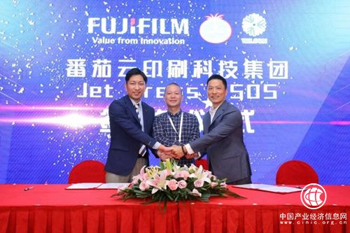 上图左起:富士胶片(中国)印艺事业部总经理大木雄次、番茄云华南区销售总经理林勇、威誉供应链(深圳)有限公司总经理张少勇,在番茄云印刷科技集团Jet Press 750S 签约仪式上