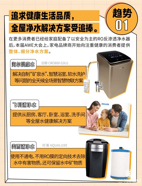 在净水系统中,消费者更加重视健康的生活品质,全屋净水解决方案受到追捧,家电品牌开始向注重健康的消费者提供整体、细分净水方案,飞利浦净水就提供从厨房、客卧、洗手间的全屋水健康解决方案。空调除菌功能几乎成为品牌标配,自清洁、UVA灭菌、抑菌滤网等黑科技百花齐放,在调节温度基础上将新鲜空气引入室内的新风空调成为厂商新的卖点,大换气量机型受到消费者青睐,格力、海信、海尔等家电品牌都在此需求发力。值得一提的是,随着消费品质提升,更多品牌开始试水衣物护理柜产品,非接触式衣物护理柜成新风尚。