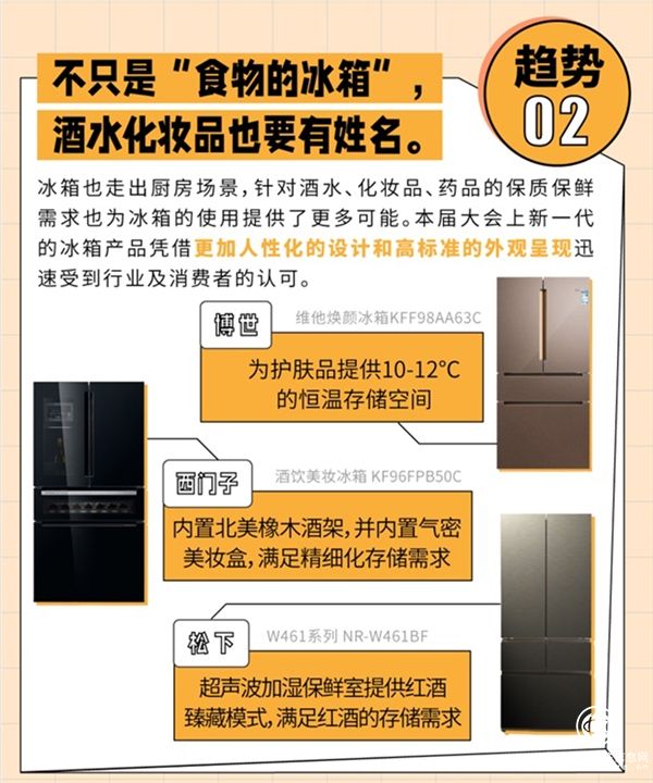 游戏电视成为电视市场新宠,电视拥有电竞显示器的诸多特质,同时作为家庭智慧大屏这一重要入口,电视厂商的智能化步伐也在进一步加快,智慧大屏为消费者提供沉浸式体验和智能家居新生活。冰箱也走出厨房场景,针对酒水、化妆品、药品的保质保鲜需求也为冰箱的使用提供了更多可能,新一代的冰箱产品凭借更加人性化的设计和高标准的外观呈现迅速受到消费者的认可,西门子冰箱就内置美橡木酒架,并内置气密美妆盒,满足今西华存储需求。消费者对于洗衣机的需求也更加细化,健康分区洗护方式已经成为一种潮流,双子、三桶洗衣机成网红,分区成为洁净新王道。