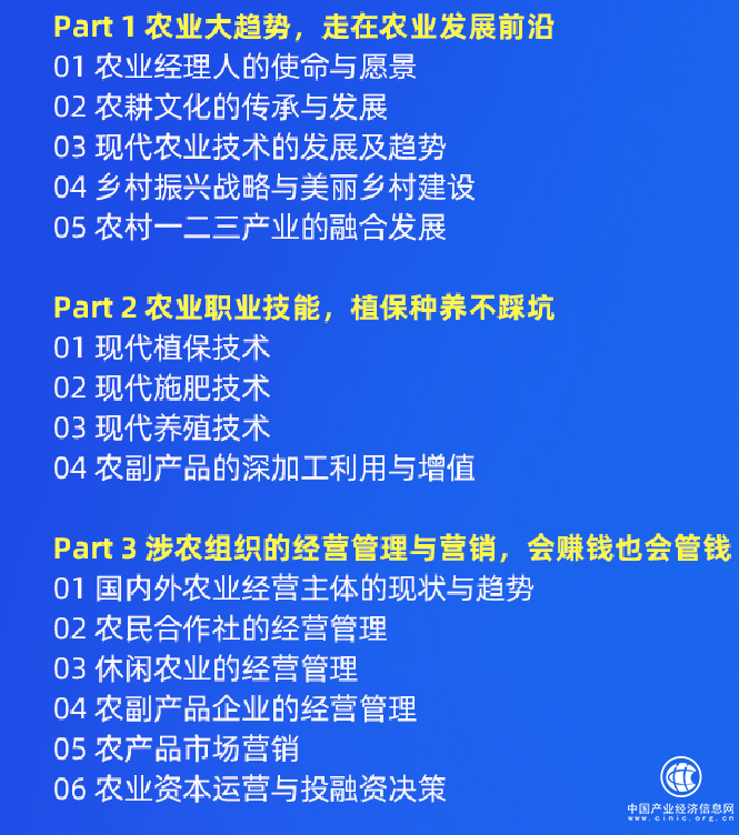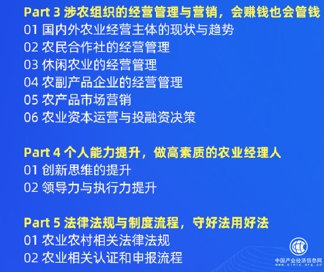 课程内容:主要包含五大块:农业大趋势、农业职业技能、涉农组织的经营管理与营销、个人能力提升、法律法规与制度流程;应该说是非常完整的五个方向。