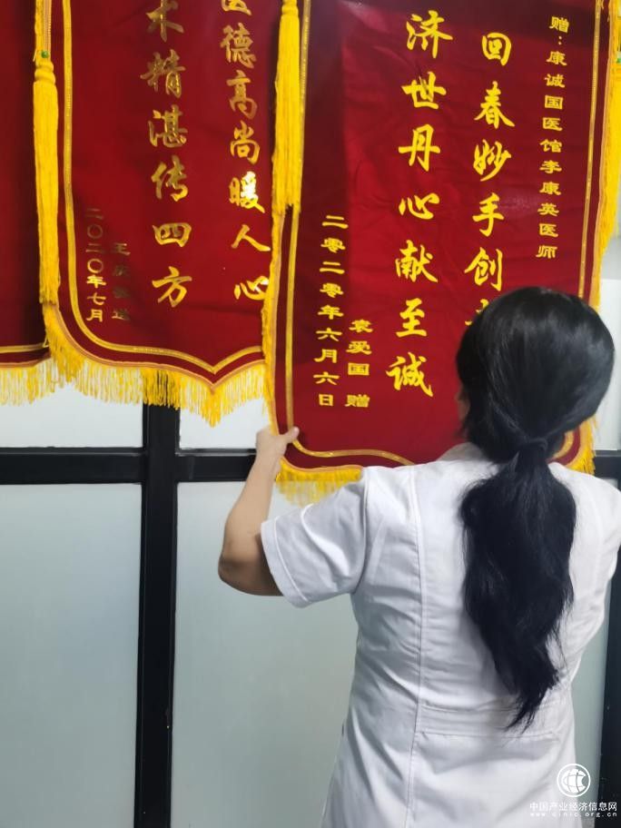 恰巧在采访期间,来了一位答谢李康英主任的患者,后来听闻是在李康英主任的精心调理下,恢复黑发的患者。现在来上门答谢,送上了一副锦旗,可谓是对李康英主任最好的褒扬。