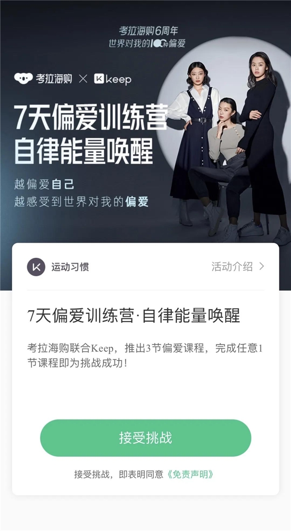 正因为懂得悦己女性的内心,才知道购物不是她们的全部,身材管理同样重要。本次营销中,考拉海购还联合Keep持续打造“偏爱行动”,推出考拉海购用户联名定制课程。基于内容的联动,把用户圈层从电商领域跨界到健身人群,实现在新用户面前的打卡签到。