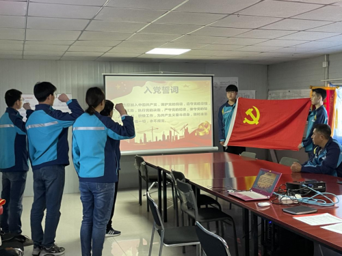 在“学党史”环节,以劳模讲党课的形式重温“西柏坡精神”,并通过互动引导的方式就“西柏坡精神”进行讨论;在“悟思想”环节,与会党员面对党旗庄严宣誓,重温入党时的初心,并在“建设人民满意工程”展板上签名,亮明身份作出承诺,以实际行动誓保项目诚信履约;在“办实事”环节,项目部为大家发放活动定制礼品,由项目总工程师详细介绍项目建设过程中攻克难关、建造人民满意工程的动人事迹;在“开新局”中,深入现场实地参观项目建设情况,全方面了解项目的背景、意义以及亮点。