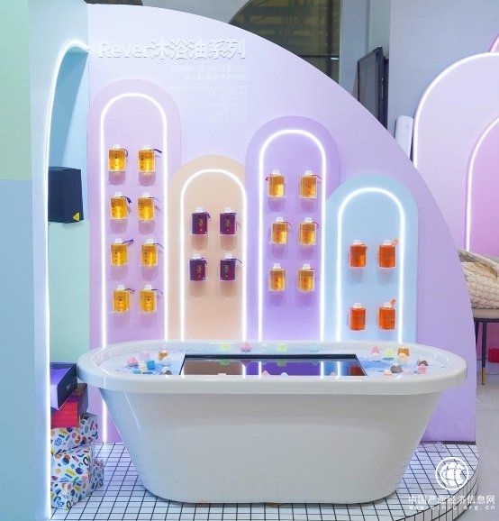 Rever黄金沐浴油整齐的挂在巨型浴缸旁边,八款萌萌哒浴爆球组成了摩天轮上下翻飞,网红爆品巧克力系列转转浴爆足浴套组和其他套装则优雅地迎接人们炙热的眼光。Rever正在通过多维感官体验给人们带来梦幻玩趣享受。