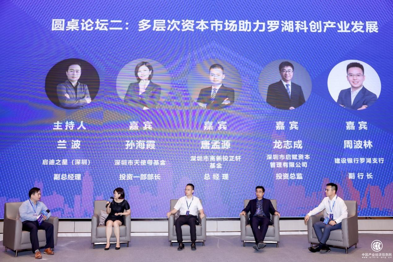 在第二场以“多层次资本市场助力罗湖科创产业发展”为主题的圆桌论坛中,主持人启迪之星(深圳)副总经理兰波与主讲嘉宾深圳市天使投资引导基金投资一部部长孙海霞、深圳市高新投正轩基金总经理唐孟源、深圳市启赋资本投资总监龙志成、建设银行罗湖支行副行长周波林,围绕发挥罗湖自身科技金融产业优势,通过多层次资本市场协同助力科创产业发展展开热烈讨论。