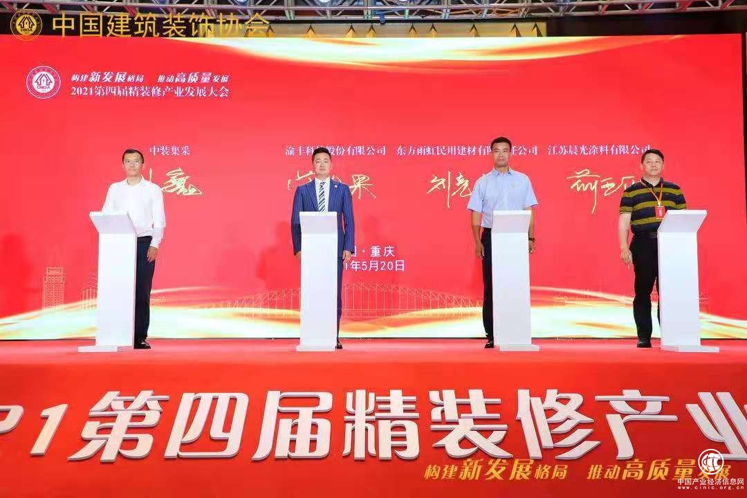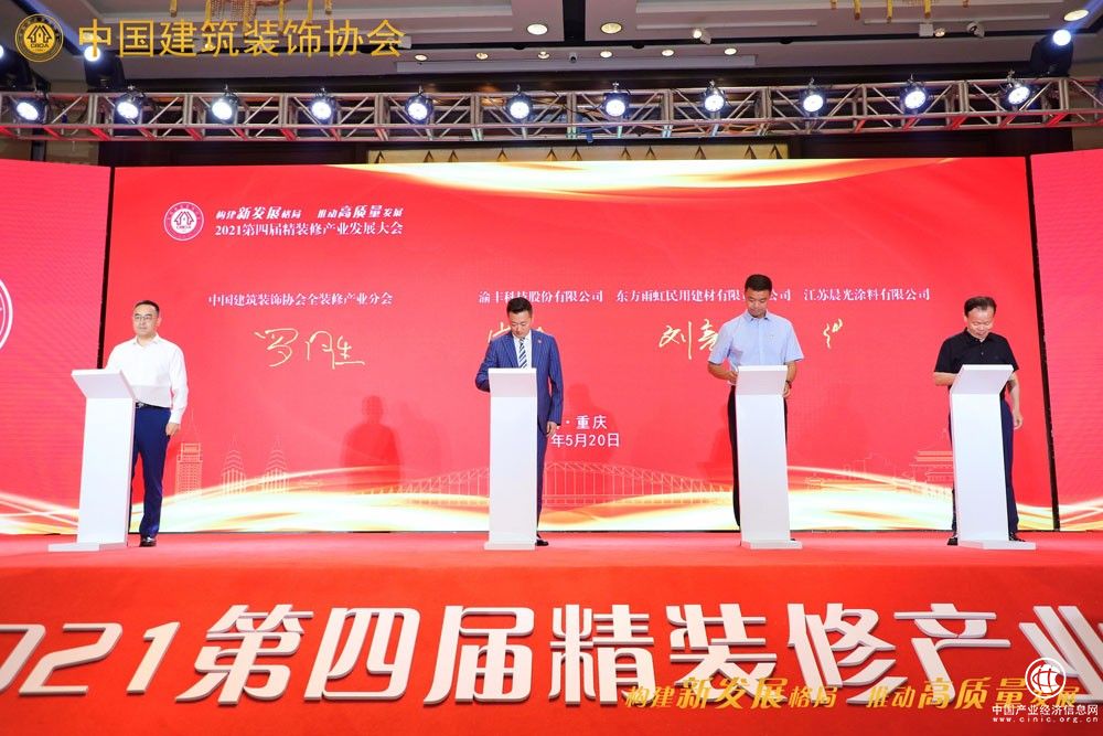 ▲中国建筑装饰协会全装修产业分会罗胜秘书长代表协会与渝丰科技股份有限公司总经理曾令果、东方雨虹民用建材有限责任公司工装事业部总经理刘亮亮、江苏晨光涂料有限公司董事长缪国元签约战略合作