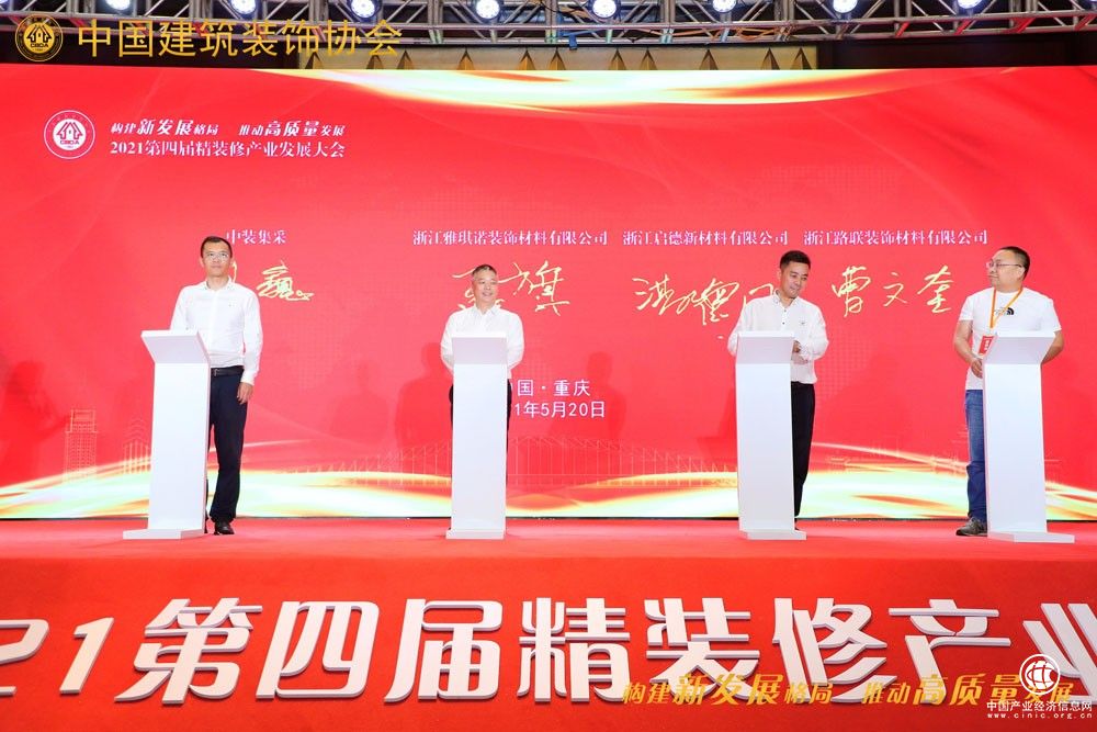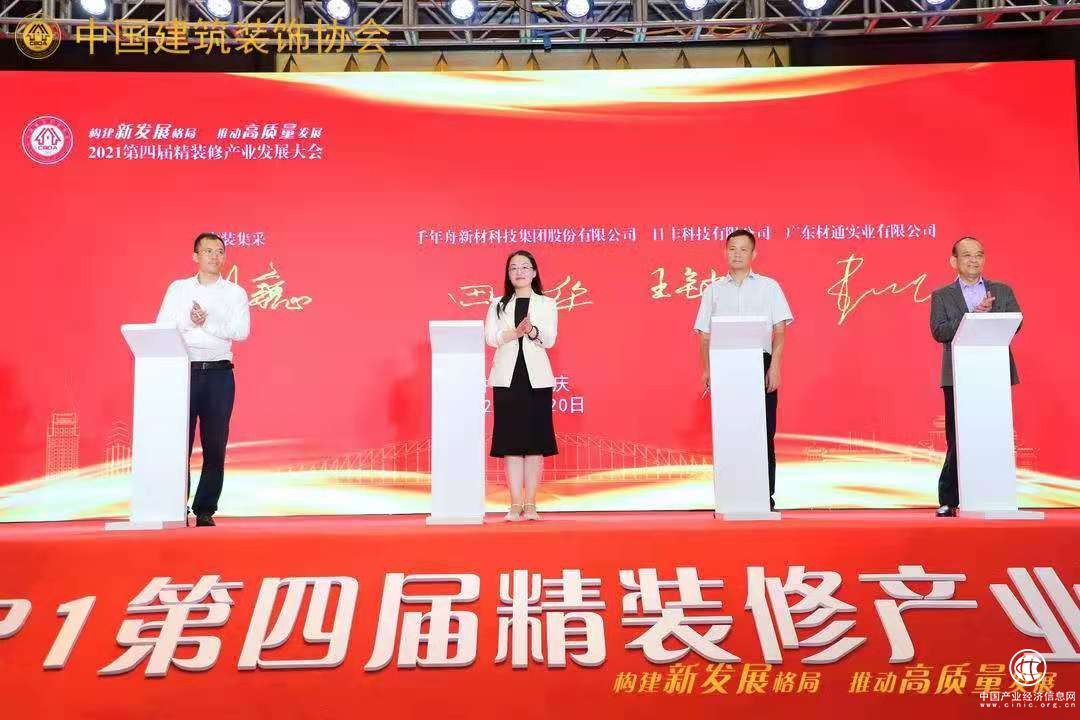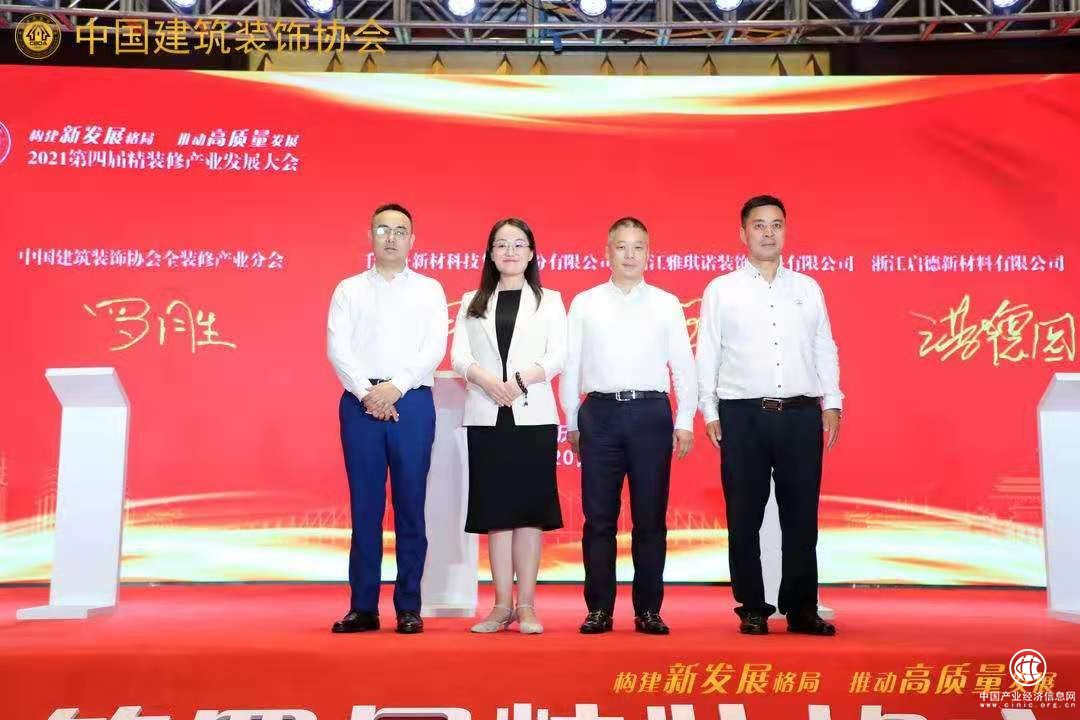 ▲中国建筑装饰协会全装修产业分会罗胜秘书长代表协会与千年舟新材科技集团股份有限公司副总裁田茂华、浙江雅琪诺装饰材料有限公司董事长王旗、浙江启德新材料有限公司董事长洪德园签约战略合作。