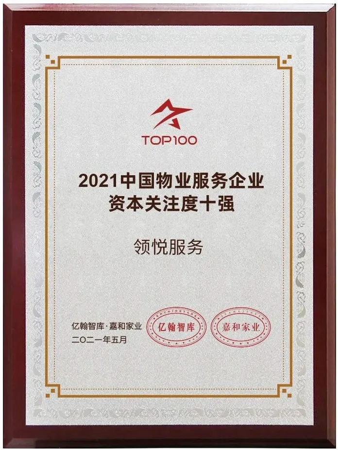 5月20日,亿翰智库及嘉和家业主办、格隆汇协办的第四届“2021中国不动产金融论坛”于深圳举办,期间“中国上市物业企业百强”研究成果正式发布。领地社区领悦服务凭借卓越的企业综合实力、优异的资本市场表现、稳健向好的投资价值和高度的社会责任感,荣获“2021中国物业服务企业资本关注度十强”。