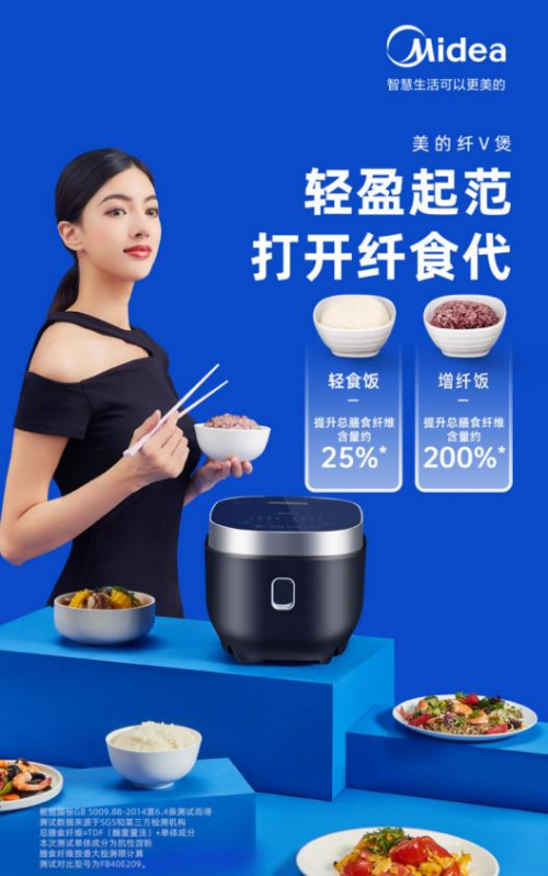 京东JC2M联手美的打造的“美的轻食纤V煲”,配备行业首创的纤香釜,对流沸腾烹煮能够让米饭更香甜,做出的“轻食饭”比普通米饭可提升总膳食纤维含量约25%;而对饮食有着更为严格控制的健身达人来说,搭配高纤食谱使用,能够提升总膳食纤维含量约200%,大大减少吃碳水的负罪感。此外,不论是养生人群还是健身塑形人群,少食、精食是他们的共同需求,所以区别于传统家庭型电饭煲,纤V煲的容积被设计得更小巧。而这些人群对智能化产品的接受度比较高,所以“智能化”也是产品必不可少的元素。