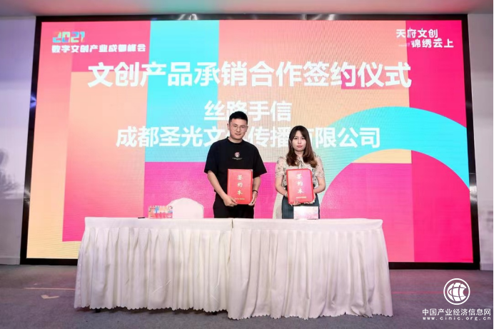 同时,敦煌博物馆文创IP——丝路手信主理人缪孟桥先生与成都圣光文化传播有限公司,签订了《文创产品承销合作书》,据了解本次合作双方将达成2000万文创产品的承销意向,将在之后为各位呈现更加具有创意与设计感的文创产品。