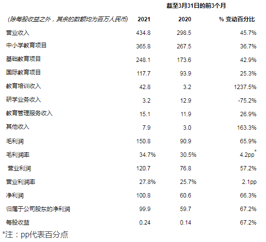 “实际上,公司的主要业务已经从去年COVID-19影响中完全恢复过来。得益于此,同比上一财年我们本季度收入有大幅增长。此外,在疫情的催化下,我们线上培训业务的启动和推广全面提速。在后疫情时代,我们将继续推动这项业务的扩张,以使其成为收入增长的重要驱动力之一。同时,我们相信在更加全面、严格的预算控制体系下,我们的毛利率和营业利润率也会稳定扩张。”首席财务官谢炜馨女士继续说道,“为了支持学校网络及多元化业务的快速扩张,我们也在同步推进财务基础设施的优化及财务业务一体化的实施”。