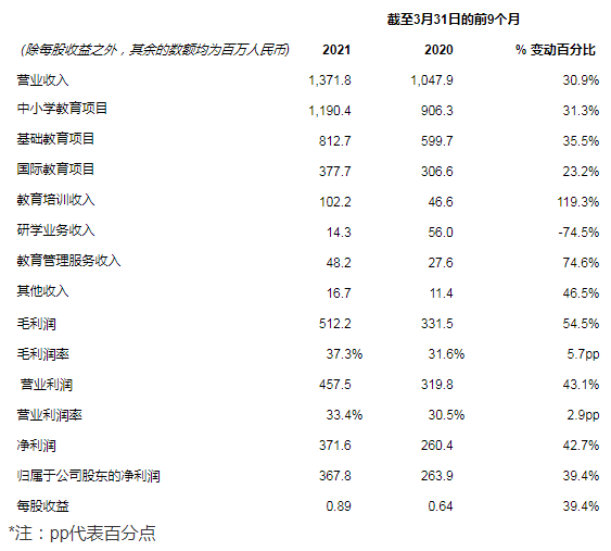 截至2021年3月31日,公司有13所自主举办学校和28所运营管理学校,共计41所学校,总在校生人数达73,629名。其中自主举办学校的在校生人数为27,310名,同比增长14.83%。其中基础教育21,906名学生,同比增长15.9%,国际教育5,404名学生,同比增长10.6%;
