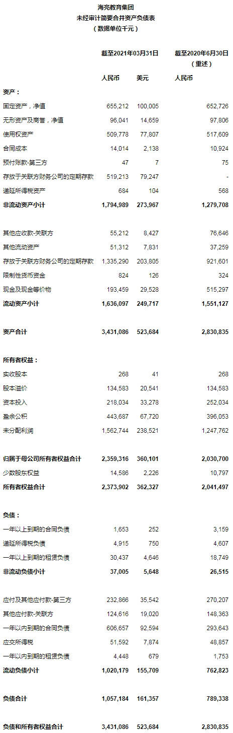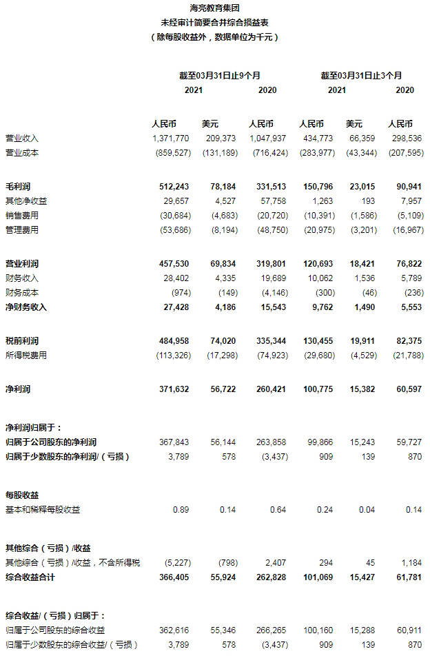 海亮教育集团有限公司(纳斯达克股票代码:HLG)(“海亮教育”、“公司”或“我们”),一家中小学教育管理服务提供商,于今日宣布其截至于2021年3月31日的2021财年第三季度业绩。