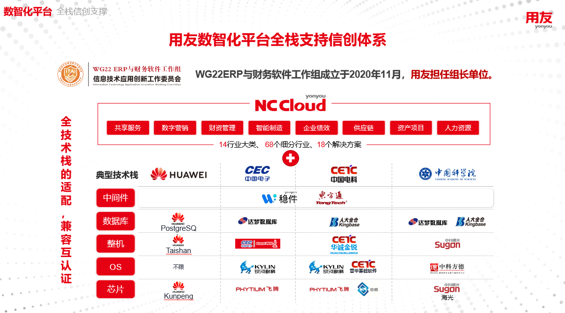 同时,为了推动信创产业发展,用友参与了信创联盟、信创工委会、WG22 ERP与财务软件工作组等组织机构。并且用友的核心产品比如NC Cloud,与华为鲲鹏体系和中国电子PKS体系等国内主流的信创产品进行全栈适配。