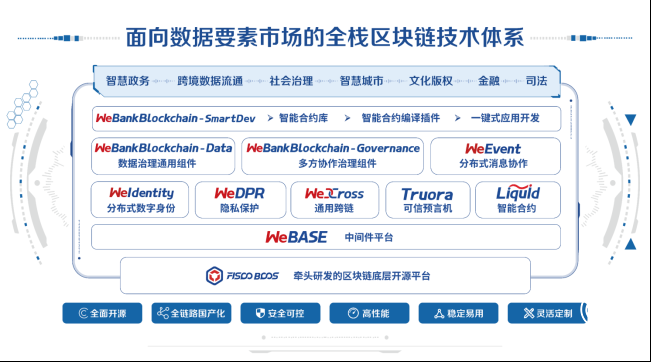 在展区,微众银行全方位展示了其面向数据要素市场构建的全栈区块链技术体系。据微众银行区块链运营拓展负责人李贺介绍,目前,微众银行区块链正式发布的核心开源项目已超过10个,如中间件平台WeBASE、跨链协作平台WeCross、实体身份认证与可信数据交换方案WeIdentity、分布式事件驱动架构WeEvent等。这些开源区块链技术,也已经实际运用到如粤澳健康码跨境互认系统、绿色出行普惠平台、人民版权平台、区块链司法存证及仲裁平台等智慧政务、社会治理、金融服务、供应链金融、版权保护领域的创新区块链应用项目中。