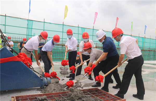 仪式最后,各单位代表铲混凝土共同进行了封顶。