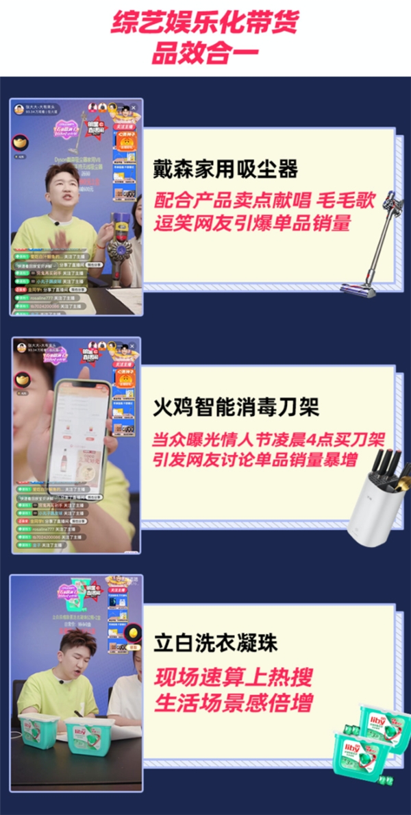 最终,赢得消费者极高赞美度的张大大当晚涨粉7万,戴森吸尘器、火鸡消毒刀架、立白洗衣凝珠等单品销量暴增。