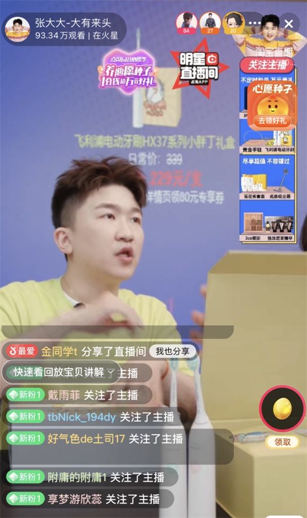 6月6日晚,张大大坐镇“点淘明星直播间”,出任“点淘上心官“,开启直播带货首秀。