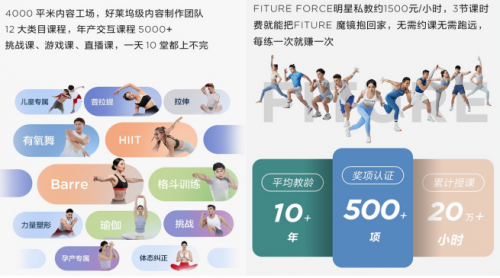 在自制内容方面,FITURE现已签约近20位健身教练,组建了一个累计授课时长超20万小时,平均教学经验10年以上,累计奖项认证500多个的“FITURE FORCE全明星教练”。在对标好莱坞影视制作规格来打造的“健身梦工场”,内容团队可通过一个囊括教练、拍摄及后期、音乐、开发和AI的数字化“交互内容创作管理系统”实现全年5000节健身课程内容更新的产能。