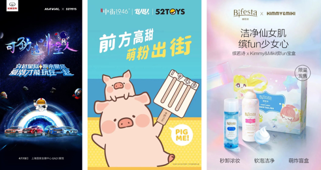随着多元兴趣圈层的涌现,为了更好的触达年轻消费者,近年来52TOYS积极与金融、美妆、汽车、3C、母婴等各领域品牌展开跨界合作,通过多维度、多渠道的商业合作,全面包裹当代青年的生活方式,做到52TOYS自有IP的文化输出。