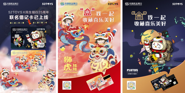 其中与中国民生银行更是推出“52TOYS × 中国民生银行联名借记卡”、打造52TOYS主题网红网点、并启动【“盒”我在一起】系列主题活动。不仅实现了线上线下流量IP的文化跨界,更是新生收藏玩具品牌与传统金融行业的创新结合,实现了“时尚与传统”、“潮生活+金融”的强烈碰撞与深度融合,迸发出潮趣新体验,收获了大众,特别是年轻消费群体的广泛青睐。