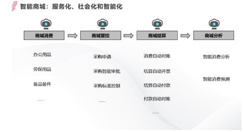 智能商城包括:为全体员工提供商城服务,实现部分采购业务无报销、员工无垫资,提高员工满意度;企业通过搭建智能商城平台,与社会化互联网电商平台进行集成,实现采购在线、费用管控、采购资源和采购数据的有机融合,是采购报销的一次互联网社会化升级;商旅平台实现自动比价、自动下单、自动对账、自动结账、自动分析与预测;智能化实现自动比价、自动下单、自动对账、自动结账和自动分析与预测.。